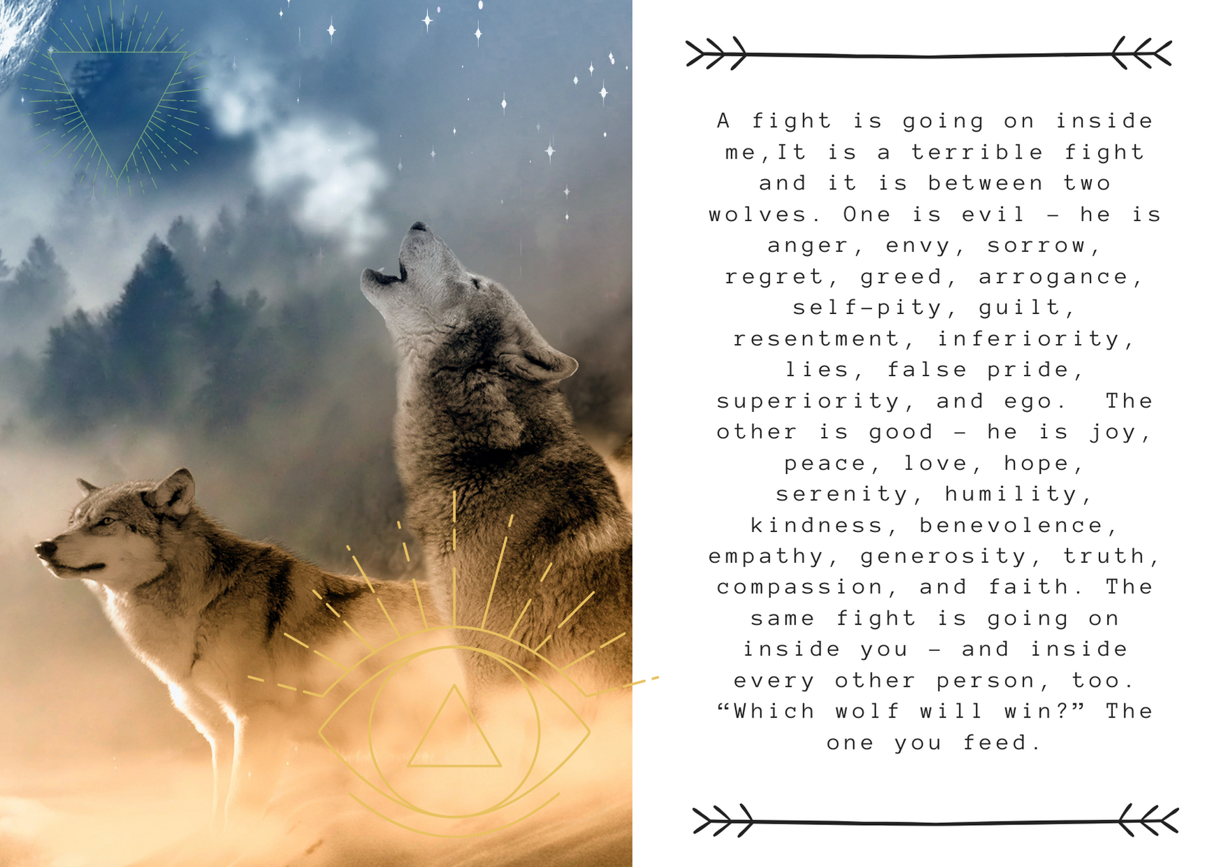 We will be working with the theme ‘The wolf you feed’, based on the beautiful allegory below about the two wolves that live within each of us.